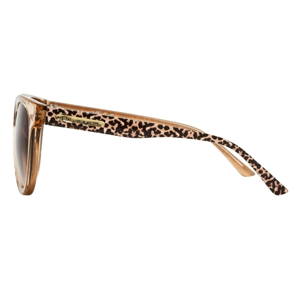 Panama Jack 25 136. Estilo cálido con actitud salvaje. El modelo Panama Jack 25 136 combina una montura translúcida en tono ámbar con lentes marrones que filtran la luz suavemente, ofreciendo protección y sofisticación. Las varillas con estampado animal print aportan un toque audaz y moderno, ideal para mujeres que buscan destacar con elegancia y personalidad. Su forma redonda y diseño ligero lo convierten en el accesorio perfecto para looks casuales, urbanos o de inspiración bohemia.